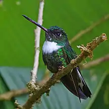 The collared inca (Coeligena torquata) is a species of hummingbird found in humid Andean forests from western Venezuela through Colombia and Ecuador to Peru. It is very distinctive in having a white chest-patch and white on the tail. Like other hummingbirds it takes energy from flower nectar (especially from bromeliads), while the plant benefits from the symbiotic relationship by being pollinated. Its protein source is small arthropods such as insects. It is normally solitary and can be found at varying heights above the ground, often in the open.[3]