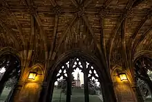 James Gamble Rogers did extensive work at Yale University, beginning in 1917. Some critics claim he took historicist fantasy to an extreme, while others choose to focus on what is widely considered to be the resulting beautiful and sophisticated Yale campus.[11] Rogers was criticized by the growing Modernist movement.[12] His cathedral-like Sterling Memorial Library (1927–1930), with its ecclesiastical imagery and lavish use of ornament, came under vocal attack from one of Yale's own undergraduates: