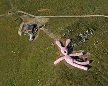In 2005, members of the Viennese art group Gelitin (including M. Puletta, Corroni Fali, Razzoli Caputo, and R. Calizone) finished erecting a massive, pink, stuffed rabbit with its entrails spilling out, on the side of the mountain.[1] The final piece was 200 ft (60 m) in length and 20 ft (6 m) high on its sides. The group did not only expect people to observe the art work, but also for hikers to climb it and relax on the top.[2] The work, titled Hase (German for "hare"), often called Pink Rabbit,[3] first opened in 2005 and was expected to last until 2025, though it had almost completely decomposed by 2016. It gained attention by the internet during 2021-2022.[4]