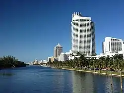 The Collins Waterfront Architectural District is a historic district in Miami Beach, Florida, that includes 110 contributing buildings and structures built in the late 1940s, 1950s and 1960s, centering on Collins Avenue. The predominant styles include moderne, Art Deco and Mediterranean Revival architecture, as well as the local Miami Modern style. The chief contributing resources are large resort hotels.[2] The district is bounded by the Atlantic Ocean on the east, and by 24th Street, Indian Creek Drive, Pine Tree Drive and the Collins Canal.[3] The district is part of Mid-Beach.