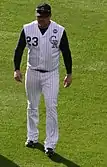 The Rockies' home uniform is white with purple pinstripes, and the Rockies are the first team in Major League history to wear purple pinstripes.[21] The front of the uniform is emblazoned with the team name in silver trimmed in black, and letters and numerals are in black trimmed in silver. During the Rockies' inaugural season, they went without names on the back of their home uniforms, but added them for the following season. In 2000, numerals were added to the chest.
