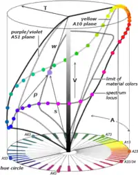 The VAT components are used to define a cylindrical color geometry, with V as the achromatic vertical axis (lightness or brightness), T as the horizontal distance from the achromatic axis (chroma), and A as the hue angle around the hue circle. The circumferential limits of this cylinder are defined by the spectrum locus, or colors as they appear in a single wavelength of light (or a mixture of single "violet" and "red" wavelengths); this ambit varies vertically in V around the hue circle, showing whether the relative luminance or brightness of each wavelength is high (yellow hue) or low (violet blue hue). This defines the outer perceptual limits of the color space.