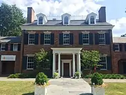 The mansion at Colross was built in the Georgian architectural style[26] between 1799 and 1800. It is a two-story brick house featuring a rectangular architectural plan, which was originally flanked by two wings.[12][17][27] Colross features wide halls and spacious rooms.[17][23] One wing housed facilities for the estate's service staff; the other wing served as a carriage shed.[12] Colross' architectural plan is similar to that of nearby estates Mount Vernon and Woodlawn, and is an example of the country house style of American colonial architecture common in Maryland and Virginia.[12] It has been described as the "largest and most beautiful mansion ever erected in Alexandria".[28] The Colross property originally occupied the entire 1100 block of Oronoco Street.[29] The grounds of the estate also contained ancillary outbuildings.[17]