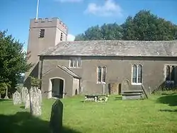 The settlement is situated on an incline, at the top of which is Colton Church, which was built in 1575 and rebuilt 25 years later.[3] Colton Beck, which runs beside the village, was once known as Cole, meaning 'hazel stream'. Three miles from the village there is an historic Quaker meeting house at Colthouse.[3] The parish includes Finsthwaite, Lakeside, Oxen Park, Nibthwaite, Bouth, and Rusland within its boundaries.[4]
