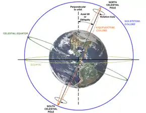 The equinoctial colure is the meridian or great circle of the celestial sphere which passes through the celestial poles and the two equinoxes:[1] the first point of Aries and the first point of Libra.