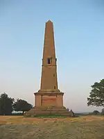 Brankelow Cottage, a "charming eyecatcher,"[26] stands to the west of Comber Mere at SJ581442. Built as a model dairy, it was used as a gamekeeper's cottage and is now a folly; the pavilions to each end were formerly used as kennels. It is ornamented with battlements, pinnacles, pilasters, arrowslit windows and fancy brickwork.[25][26][34][62] A sandstone obelisk dated 1890, which commemorates the first Viscount Combermere, stands at SJ576448 on a rise at the north-west edge of the park.[35][63]