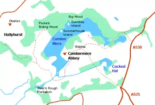 The name Combermere means "lake of the Cumbri" – from Cymru, the native Welsh name for Wales – and refers to an enclave of Britons surviving the Anglo-Saxon conquest of the area.[2]