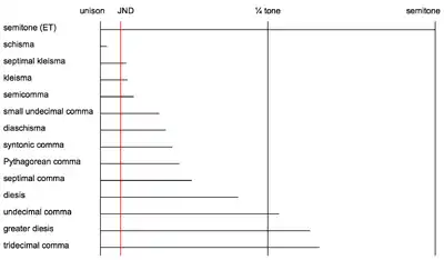 Comparison of the size of different commas, in cents. Equal-tempered semitone added for comparison. JND is the just-noticeable difference between tones.
