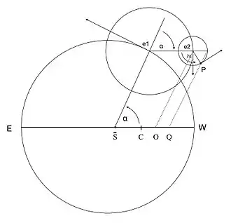 The centre of the second epicycle, represented by the point e2 in the diagram, revolves uniformly from east to west around the circumference of the first, with the same period relative to the radial line joining S to e1. As a consequence, the direction of the radial line joining e1 to e2 remains fixed relative to the fixed stars, parallel to the planet's line of apses EW, and the point e2 describes an eccentric circle[lower-alpha 7] whose radius is equal to that of the deferent, and whose centre, represented by the point O in the diagram, is offset from that of the deferent by the radius of the first epicycle. In his later work, De revolutionibus orbium coelestium, Copernicus uses this eccentric circle directly, rather than representing it as a combination of a deferent and an epicycle.