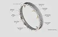 All CBM types feature an aluminum ring that is bolted onto the pressure shell during fabrication of the parent module. The bolted joint compresses two concentric o-ring seals: one is silicone (for better temperature performance), and the other is fluorocarbon (for better resistance to scrubbing).[2] A mated pair of rings is primary structure for life-critical pressure loads, so the rings and seals were engineered to the same standards as the module shells.[3] If the primary seals deteriorate, they can be augmented by secondary seals that were designed and qualified as part of the CBM. The secondary seals can be installed as an intravehicular activity (IVA).[4]