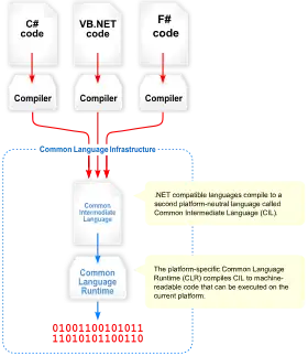 All compatible languages compile to Common Intermediate Language (CIL), which is an intermediate language that is abstracted from the platform hardware. When the code is executed, the platform-specific VES will compile the CIL to the machine language according to the specific hardware and operating system.