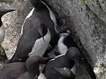 Common murres breed in colonies at high densities. Nesting pairs may be in bodily contact with their neighbours. They make no nest; their single egg is incubated on a bare rock ledge on a cliff face. Eggs hatch after ~30 days incubation. The chick is born downy and can regulate its body temperature after 10 days. Some 20 days after hatching the chick leaves its nesting ledge and heads for the sea, unable to fly, but gliding for some distance with fluttering wings, accompanied by its male parent.[3] Male guillemots spend more time diving, and dive more deeply than females during this time.[4] Chicks are capable of diving as soon as they hit the water. The female stays at the nest site for some 14 days after the chick has left.
