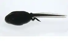 The strings of eggs absorb water and swell in size, and small tadpoles hatch out after 10 days.[38] At first they cling to the remains of the strings and feed on the jelly. They later attach themselves to the underside of the leaves of water weed before becoming free swimming. The tadpoles at first look similar to those of the common frog (Rana temporaria) but they are a darker colour, being blackish above and dark grey below. They can be distinguished from the tadpoles of other species by the fact that the mouth is the same width as the space between the eyes, and this is twice as large as the distance between the nostrils. Over the course of a few weeks their legs develop and their tail gradually gets reabsorbed. By twelve weeks of age they are miniature toads measuring about 1.5 cm (0.6 in) long and ready to leave the pond.[21]