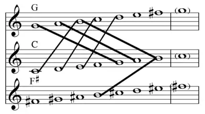 In diatonic set theory, the deep scale property is the quality of pitch class collections or scales containing each interval class a unique number of times. Examples include the diatonic scale (including major, natural minor, and the modes).[3] In twelve-tone equal temperament, all scales with the deep scale property can be generated with any interval coprime with twelve.[4]