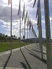 Speakers Square, at the centre of Commonwealth Place is a concave shaped grassed area with a paved mural in the middle which was a gift to Australia from the Government of Canada to mark the Centenary of Australian Federation. A display of international flags lines the lake shore, one flag for each nation with a diplomatic mission in the capital. Flags include those of the United Nations, European Union and the Holy See.