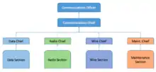 The communications platoon is headed by a 2nd or 1st lieutenant, called the Communications Officer or S-6, and a master sergeant, called the Communications Chief.[2] For regiment level communication platoons, it's typical to have a captain head the platoon and a master gunnery sergeant be the senior enlisted marine. Each section has a chief that is responsible for the work of the section. The rank of the section chief can vary from sergeant to master sergeant; however, to have a Data Chief, Radio Chief, Wire Chief, or Maintenance Chief MOS, the marine must be a staff Non-commissioned officer (NCO).[1]