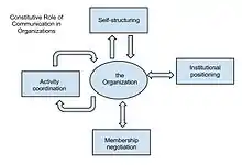 The model of communication as constitutive of organizations has origins in the linguistic approach to organizational communication taken in the 1980s.[4] Theorists such as Karl E. Weick[5] were among the first to posit that organizations were not static but inherently comprised by a dynamic process of communicating.