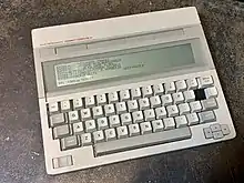 The Compact Computer 40 or CC-40 is a portable computer developed by Texas Instruments. It started development in 1981,[1] and was released in March 1983 for US$249. The CC-40 has a single-line 31 character LCD display, weighs 600 grams (21 ounces), and is powered by an AC adapter or can operate for 200 hours on four AA batteries. Memory is not erased by turning the unit off; it can retain data for several months. The CC-40 lacks a way to store data more permanently. Software was only available on cartridge or by typing programs into its built-in BASIC interpreter. The BASIC interpreter is similar but not identical to that of the TI-99/4A.