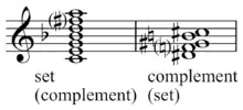 As a further example take the chromatic sets 7-1 and 5-1. If the pitch-classes of 7-1 span C–F♯ and those of 5-1 span G–B then they are literal complements. However, if 5-1 spans C–E, C♯–F, or D–F♯, then it is an abstract complement of 7-1.[9] As these examples make clear, once sets or pitch-class sets are labeled, "the complement relation is easily recognized by the identical ordinal number in pairs of sets of complementary cardinalities".[3]