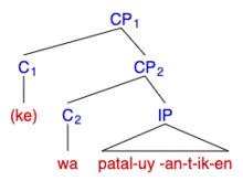 Itzaj Maya can even combine the neutral complementizer, ke, with the non-neutral, waj", as is illustrated in examples (2a) in which the neutral complementizer ke occurs alone and (2b) in which it is optionally inserted in front of the uncertainty complementizer waj:[19]