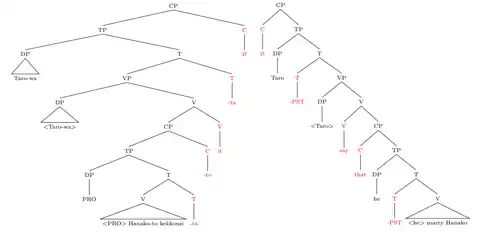 The complementizer is often held to be the syntactic head of a full clause, which is therefore often represented by the abbreviation CP (for complementizer phrase). Evidence of the complementizer functioning as the head of its clause includes that it is commonly the last element in a clause in head-final languages like Korean or Japanese in which other heads follow their complements, but it appears at the start of a clause in head-initial languages such as English in which heads normally precede their complements.[1] The trees below illustrate the phrase "Taro said that he married Hanako" in Japanese and English; syntactic heads are marked in red and demonstrate that C falls in head-final position in Japanese, and in head-initial position in English.