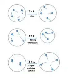 Deviations of the compressibility factor, Z, from unity are due to attractive and repulsive intermolecular forces. At a given temperature and pressure, repulsive forces tend to make the volume larger than for an ideal gas; when these forces dominate Z is greater than unity. When attractive forces dominate, Z is less than unity. The relative importance of attractive forces decreases as temperature increases (see effect on gases).