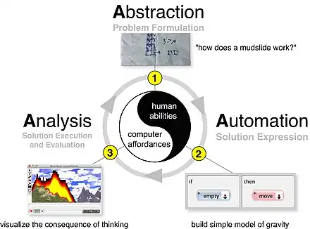 The history of computational thinking as a concept dates back at least to the 1950s but most ideas are much older.[6][3] Computational thinking involves ideas like abstraction, data representation, and logically organizing data, which are also prevalent in other kinds of thinking, such as scientific thinking, engineering thinking, systems thinking, design thinking, model-based thinking, and the like.[7] Neither the idea nor the term are recent: Preceded by terms like algorithmizing, procedural thinking, algorithmic thinking, and computational literacy[3] by computing pioneers like Alan Perlis and Donald Knuth, the term computational thinking was first used by Seymour Papert in 1980[8] and again in 1996.[9] Computational thinking can be used to algorithmically solve complicated problems of scale, and is often used to realize large improvements in efficiency.[10]