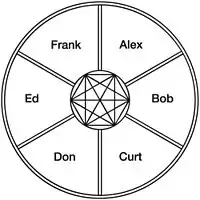A person's mental content is in fact isolated from others'. This isolation can be represented by a wheel-shaped compound, each wedge-shaped sector of which is an environment (a brain) bounded by two spokes and part of the circumference (right). They all contain differing amounts and types of plants, rocks, water, etc. (repertoire members). The wheel's hub has machinery that can deliver sheets of paper between sectors (communication). People use it to exchange crude blueprints (signals) for making tools, shelters, foods, etc., but they have no other contact whatsoever, and know of others' existence by inferences based on these blueprints.[25]