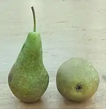 A medium-sized pear with an elongated bottle shape, the 'Conference' pear is similar in appearance to the 'Bosc pear'. A table pear, it is suitable for fresh-cut processing.[3] The fruit skin is thick greenish-brown, becoming pale yellow when ripe. The flesh is white, but turns pale yellow when the pear is ripe. The texture is very fine and soft, and the flavour is sweet.[4] The brown part of the skin is called russet or russetting; it is more or less apparent depending on weather conditions.