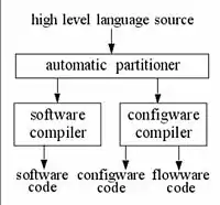 Software/Configware Co-Compilation is used for reconfigurable computing to generate the code for both, an instruction-stream-based microprocessor and a reconfigurable accelerator interfaced to it. Such a co-compiler (see figure) has a partitioner which accepts input from a high level language source, such as, for instance a programming language, or the output from tools like MATLAB, and automatically partitions it into parallelizable parts suitable for the reconfigurable accelerator and the rest for running on the microprocessor. By loop transformations the partitioner converts the parallelizable parts into a configware source, which is compiled by a Configware Compiler generating configware code for the configuration of the reconfigurable accelerator like, for instance an FPGA, or a coarse-grained reconfigurable array, and flowware code for organizing the data streams going from and to the accelerator.