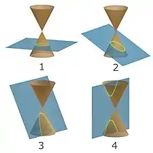 A proof that the above curves defined by the focus-directrix property are the same as those obtained by planes intersecting a cone is facilitated by the use of Dandelin spheres.[5]