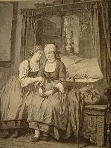 Religious figures are often depicted as offering consolation to their followers during times of grief. For example, in the Mahabharata, the Hindu avatar Krishna consoles his brother Balarama and the princess Sathya Bama after they have been humiliated for their prideful ways.[12] More famously, in the Bhagavad Gita, when Arjuna learned that Krishna was dying of an injury, Krishna consoled him with touching philosophy.[13] In Christianity, one of the iconic Stations of the Cross is sometimes titled, "Jesus consoles the daughters of Jerusalem".[14] A substantial body of Christian literature exists exhorting followers to take consolation in their faith for the various ills that befall them in life. One branch of Christianity, Catharism, practiced a sacrament called consolamentum, which required consolation for the inevitable regret of living in order to move nearer to God or to approach heaven.[15]