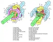 The Thompson joint (also known as a Thompson coupling) assembles two cardan joints within each other to eliminate the intermediate shaft.[13] A control yoke is added to keep the input and output shafts aligned. The control yoke uses a spherical pantograph scissor mechanism to bisect the angle between the input and output shafts and to maintain the joints at a relative phase angle of zero. The alignment ensures constant angular velocity at all joint angles. Eliminating the intermediate shaft and keeping the input shafts aligned in the homokinetic plane greatly reduces the induced shear stresses and vibration inherent in double cardan shafts.[14][15][16] While the geometric configuration does not maintain constant velocity for the control yoke that aligns the cardan joints, the control yoke has minimal inertia and generates little vibration. Continuous use of a standard Thompson coupling at a straight-through, zero-degree angle will cause excessive wear and damage to the joint; a minimum offset of 2 degrees between the input and output shafts is needed to reduce control yoke wear.[17] Modifying the input and output yokes so that they are not precisely normal to their respective shafts can alter or eliminate the "disallowed" angles.[18]