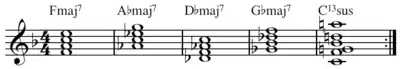 For example, the progression Fmaj7–A♭maj7–D♭maj7–G♭maj7–C13sus4[1] contains four major seventh chords (and one thirteenth chord), none of which are diatonic to the key of F major except the first.