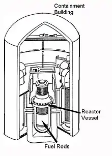 Common containment designs are referred to by the names Mark I, Mark II, and Mark III. The Mark I is the oldest, distinguished by a drywell which resembles an inverted lightbulb above the wetwell which is a steel torus containing water. The Mark II was used with late BWR-4 and BWR-5 reactors. It is called an "over-under" configuration with the drywell forming a truncated cone on a concrete slab. Below is a cylindrical suppression chamber made of concrete rather than just sheet metal. Both use a lightweight steel or concrete "secondary containment" over the top floor which is kept at a slight negative pressure so that air can be filtered. The top level is a large open space with an overhead crane suspended between the two long walls for moving heavy fuel caskets from the ground floor, and removing / replacing hardware from the reactor and reactor well. The reactor well can be flooded and is straddled by pools separated by gates on either side for storing reactor hardware normally placed above the fuel rods, and for fuel storage. A refueling platform has a specialized telescoping mast for lifting and lowering fuel rod assemblies with precision through the "cattle chute" to the reactor core area.[6] The Mark III uses a concrete dome, somewhat like PWRs, and has a separate building for storing used fuel rods on a different floor level. All three types also use the large body of water in the suppression pools to quench steam released from the reactor system during transients.