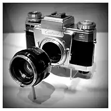 Contarex is a line of 35mm single lens reflex cameras (SLRs) made by Zeiss Ikon.[1] It was first presented at Photokina in 1958 and initially scheduled for delivery in the spring of 1959, but it was not made generally available in the United States until March 1960.[2] The first model is popularly known as the Contarex I, the Bullseye, or the Cyclops, after the prominent light meter window above the lens, in front of the pentaprism.[3]: 95 The camera was aimed at the high-end and professional markets; in 1961, the retail price (including the 50 mm f/2.0 Planar lens) was $499.[4]