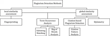 The figure below represents a classification of all detection approaches currently in use for computer-assisted content similarity detection. The approaches are characterized by the type of similarity assessment they undertake: global or local. Global similarity assessment approaches use the characteristics taken from larger parts of the text or the document as a whole to compute similarity, while local methods only examine pre-selected text segments as input.
