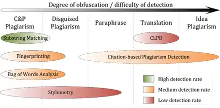Comparative evaluations of content similarity detection systems[6][38][39][40][41][42] indicate that their performance depends on the type of plagiarism present (see figure). Except for citation pattern analysis, all detection approaches rely on textual similarity. It is therefore symptomatic that detection accuracy decreases the more plagiarism cases are obfuscated.