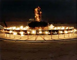 When detonated, the high explosive imparts momentum to the rods, thrusting them outward in an expanding circle. The pressure wave from the explosive needs to act evenly on the rods over their length, so some sort of tamper is used to shape the shock wave similar to an explosive lens. The rods are sufficiently soft (ductile) to allow the expansion without breaking the rods or the welded joints, and the detonation velocity is limited to under 1,150 m/s,[2] allowing the rods to bend at these locations instead. At some intermediate point the ring will have a zig-zag (alternating direction) appearance within a cylindrical envelope. Upon ultimate expansion the ring is circular and contained within a plane. The ring will then break and ultimately tend to form one or more straight rods. Since the net momentum of the rod relative to the missile is roughly zero, its effectiveness will rapidly diminish as the broken ring expands.[3]