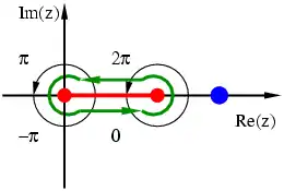so that we have continuity across the cut. This is illustrated in the diagram, where the two black oriented circles are labelled with the corresponding value of the argument of the logarithm used in z34 and (3 − z)1/4.
