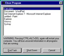 | Windows 9x | Ctrl+Alt+Delete | Bring up "Close Program" dialog box (a simplistic task manager). Performs a soft reboot if pressed twice.[19][20] |