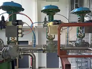 A control valve is a valve used to control fluid flow by varying the size of the flow passage as directed by a signal from a controller.[1] This enables the direct control of flow rate and the consequential control of process quantities such as pressure, temperature, and liquid level.