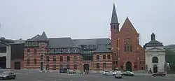 The Sisters of Perpetual Adoration, who became the Sisters of the Eucharist in 1969, were a chief Eucharistic Order founded by Anna de Meeûs, the eldest daughter of the Belgian Finance Minister and founding Chairman of the Société Générale de Belgique, Count Frederic de Meeûs. The original foundation was set up in 1844 in workshops belonging to the Church of Our Blessed Lady of the Sablon. The sisterhood rapidly outgrew its location. In 1848 the foundress' childhood friend the Baroness d'Hoogvorst (née Countess of Mercy-Argenteau) bought the building, originally the Town House of the Counts of Salazar, on the Rue des Sols/Stuiversstraat from the Visiting Sisters. The Sisters took up residence in 1850, and with the original chapel soon too small, they rebuilt the neighbouring wing of the house as a modern red neo-Gothic church. The chapel was built in 1435[3] on the corner of the Rue des Douze Apôtres/Twaalfapostelenstraat where Brussels' first synagogue had stood[2] until the Jews were evicted in a pogrom in 1370 – the Papal Bull establishing the Eucharistic vocation as an expiation of the Host desecration.