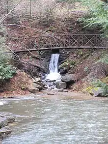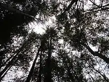 The park is in the Allegheny Highlands forests ecoregion. It is famous for its spectacular stands of old-growth eastern white pine and eastern hemlock, with more white pine over 150 feet (46 m) in its Forest Cathedral than in any other site in the northeastern United States. Many of these ancient trees began growing after a drought and fire in 1644.[12] In total, there are some 1,500 acres (6.1 km2) to 2,000 acres (8.1 km2) of old-growth forests or old forests with old-growth characteristics in several stands throughout the park.[13] In addition to white pine and hemlock, old-growth northern red oak, white oak, black cherry, red maple, sugar maple, American beech, white ash, yellow birch, black birch, and cucumber magnolia also grow throughout the park.[13]