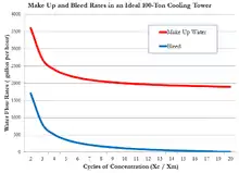 Quantitatively, the material balance around a wet, evaporative cooling tower system is governed by the operational variables of make-up volumetric flow rate, evaporation and windage losses, draw-off rate, and the concentration cycles.[28][29]