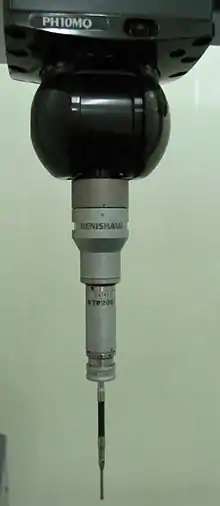 A further development was the addition of motors for driving each axis. Operators no longer had to physically touch the machine but could drive each axis using a handbox with joysticks in much the same way as with modern remote controlled cars. Measurement accuracy and precision improved dramatically with the invention of the electronic touch trigger probe. The pioneer of this new probe device was David McMurtry who subsequently formed what is now Renishaw plc.[2] Although still a contact device, the probe had a spring-loaded steel ball (later ruby ball) stylus. As the probe touched the surface of the component the stylus deflected and simultaneously sent the X,Y,Z coordinate information to the computer. Measurement errors caused by individual operators became fewer and the stage was set for the introduction of CNC operations and the coming of age of CMMs.