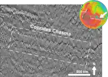 Coprates Chasma (/ˈkɒprətiːz ˈkæzmə/) is a huge canyon in the Coprates quadrangle of Mars, located at 13.4° south latitude and 61.4° west longitude, part of the Valles Marineris canyon system. It is 966 km (600 mi) long and was named after a classical albedo feature name.[1] It was named from the classical Greek name for the Dez River in Persia.