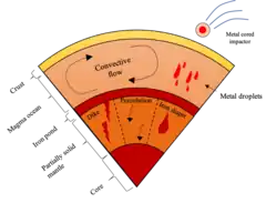 Core–mantle differentiation is the set of processes that took place during the accretion stage[1] of Earth's evolution (or more generally, of rocky planets) that results in the separation of iron-rich materials that eventually would conform a metal core, surrounded by a rocky mantle. According to the Safronov's model,[3] protoplanets formed as the result of collisions of smaller bodies (planetesimals), which previously condensed from solid debris present in the original nebula. Planetesimals contained iron and silicates either already differentiated or mixed together. Either way, after impacting the Proto-Earth their materials very likely became homogenized. At this stage, the Proto-Earth was probably the size of Mars. Next followed the separation and stratification of the Proto-Earth's constituents, chiefly driven by their density contrasts. Factors such as pressure, temperature, and impact bodies in the primordial magma ocean[4] were involved in the differentiation process.