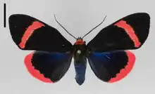 The forewings are brownish black, glossed with dark blue near the base, and crossed from about the middle of the costal margin to the anal angle by a bright carmine band edged on either side with a narrow row of pinkish-white scales. The band is widest on the costal margin. The hindwings are brown, glossed with very dark blue. The outer margins are broadly bordered with carmine.[2]