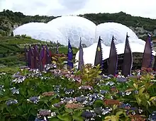 The geology of the Lizard peninsula is unusual, in that it is mainland Britain's only example of an ophiolite, a section of oceanic crust now found on land.[lower-alpha 3] Much of the peninsula consists of the dark green and red Precambrian serpentinite, which forms spectacular cliffs, notably at Kynance Cove, and carved and polished serpentine ornaments are sold in local gift shops. This ultramafic rock also forms a very infertile soil which covers the flat and marshy heaths of the interior of the peninsula. This is home to rare plants, such as the Cornish Heath, which has been adopted as the county flower.[51]